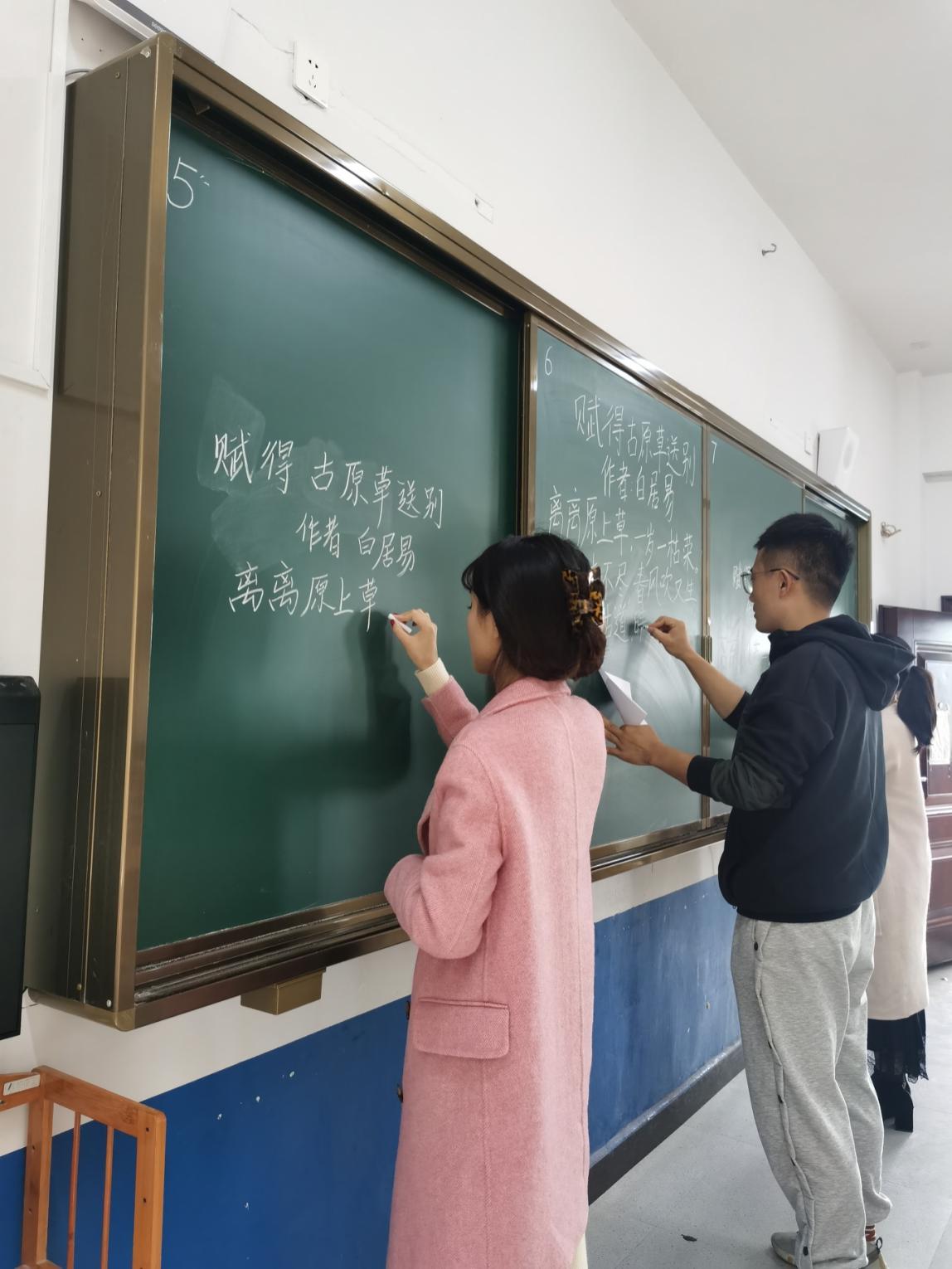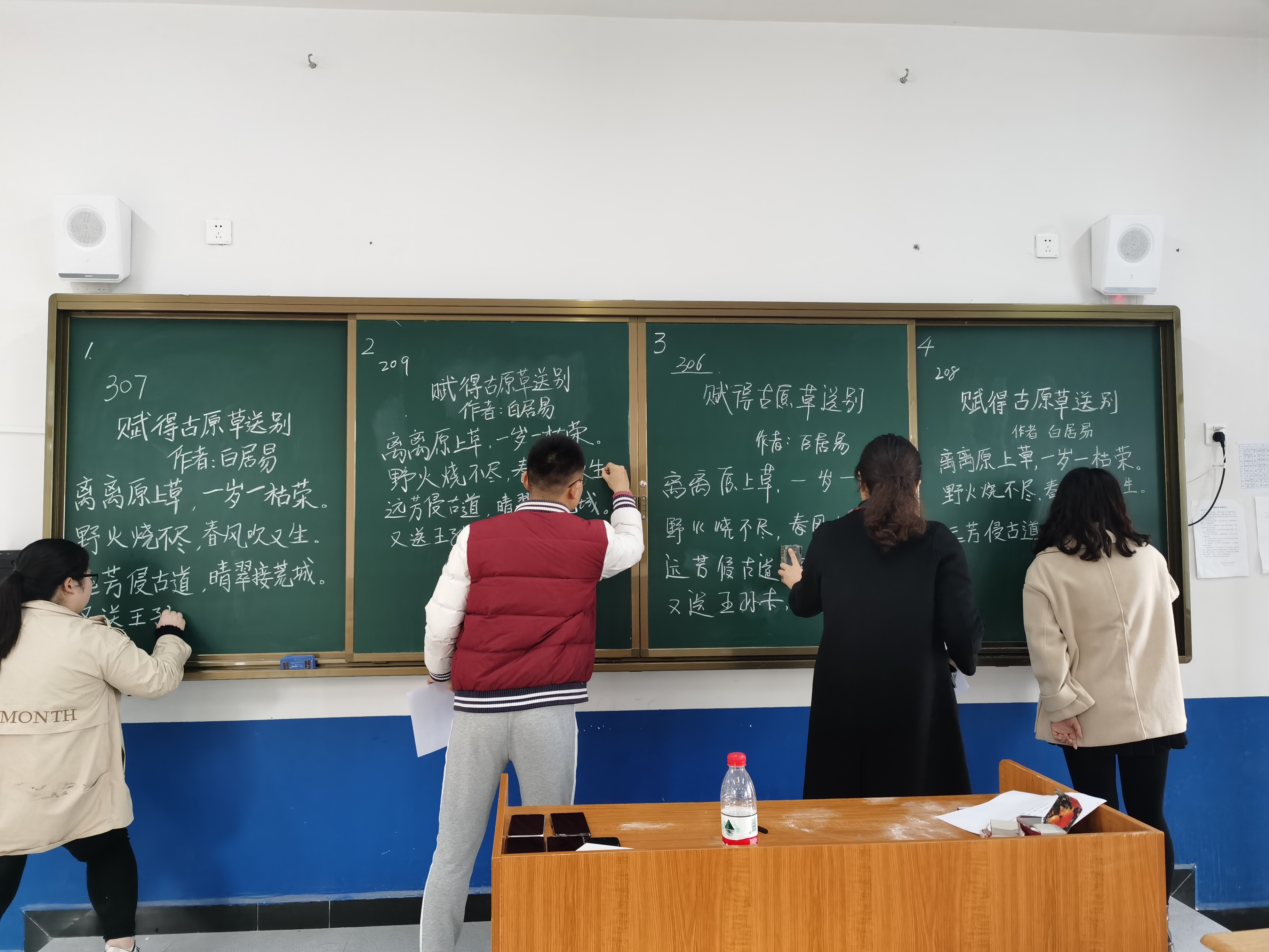 第一部分為鋼筆字、粉筆字考核。此項(xiàng)考核規(guī)定教師們在20分鐘內(nèi)完成《賦得古原草送別》鋼筆字和粉筆字作品。比賽中,老師們都全神貫注于作品的書寫,起承轉(zhuǎn)合,盡力在書寫中表現(xiàn)出自己的最高水平。評委們從書寫的規(guī)范、美觀、運(yùn)筆是否流暢等方面對參賽作品進(jìn)行了認(rèn)真的評審。粉筆字運(yùn)用于每天的教學(xué),是老師最重要的基本功。此項(xiàng)考核,不僅提高了教師的專業(yè)技能水平,促進(jìn)了教師的專業(yè)成長,同時也是對中國傳統(tǒng)文化的傳承,讓大家感受漢字之美。