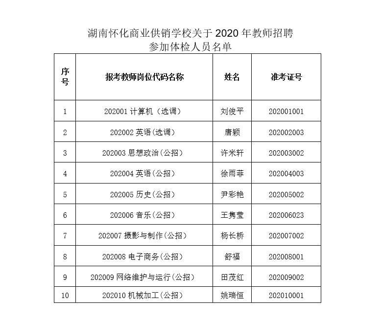 根據(jù)《湖南懷化商業(yè)供銷學(xué)校2020年教師招聘公告》(下簡稱《教師招聘公告》)有關(guān)規(guī)定,2020年湖南懷化商業(yè)供銷學(xué)校教師招聘筆試、說課、面試工作已經(jīng)結(jié)束,考生考試成績分別于2020年12月6日、7日在湖南懷化商業(yè)供銷學(xué)校官網(wǎng)發(fā)布了公示,現(xiàn)就體檢有關(guān)事宜公告如下: