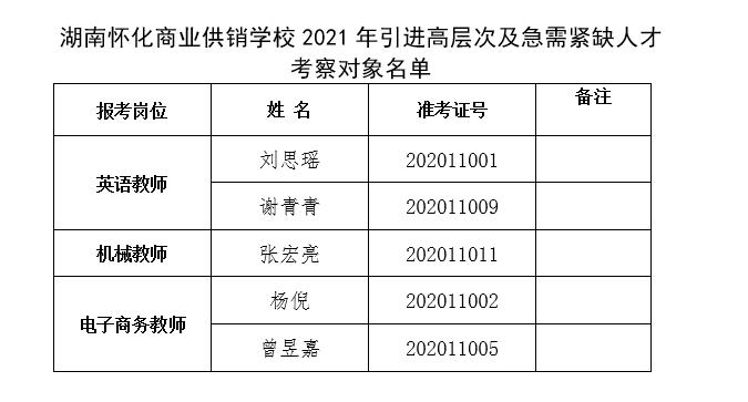 根據(jù)2020年11月23日中共懷化市委人才工作領(lǐng)導(dǎo)小組辦公室《懷化市2021年市直企事業(yè)單位引進(jìn)高層次及急需緊缺人才公告》的有關(guān)精神,經(jīng)報(bào)名、資格審查、考試和體檢,報(bào)考應(yīng)聘我校的5名同志(英語(yǔ)教師崗位謝青青、劉思瑤,機(jī)械工程教師崗位張宏亮,電子商務(wù)教師崗位楊倪、曾昱嘉)被確定為考察對(duì)象。為做本次引進(jìn)人才考察工作,特制定本方案。